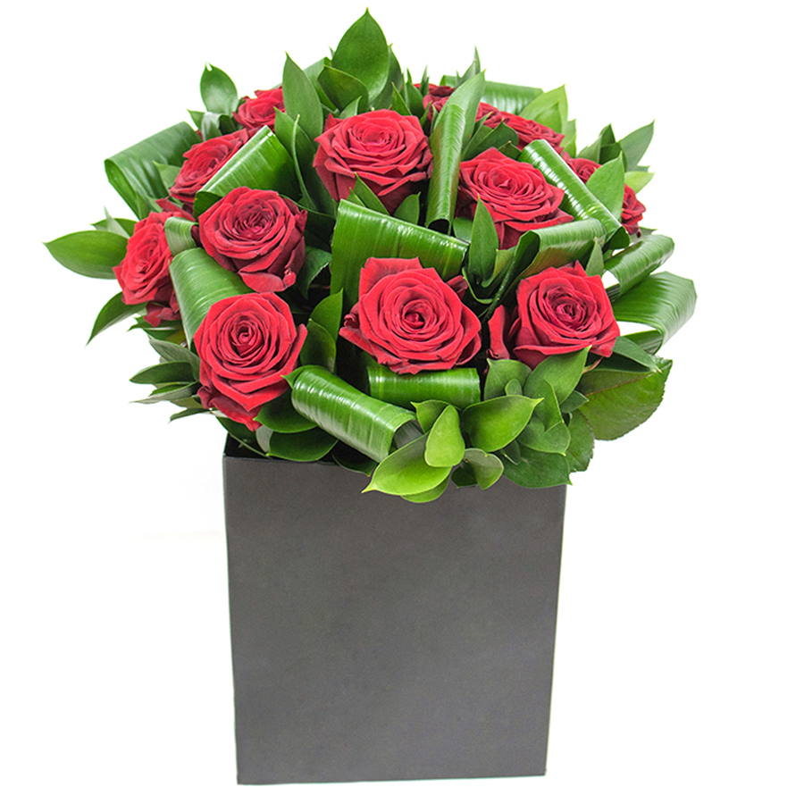 Enhance your space with the luxurious allure of our opulent bouquet, meticulously designed for those who appreciate the finer things in life. This stunning arrangement features a blend of vivid red roses, beautifully balanced with rich aspidistra leaves and the soft, graceful touch of ruscus.
